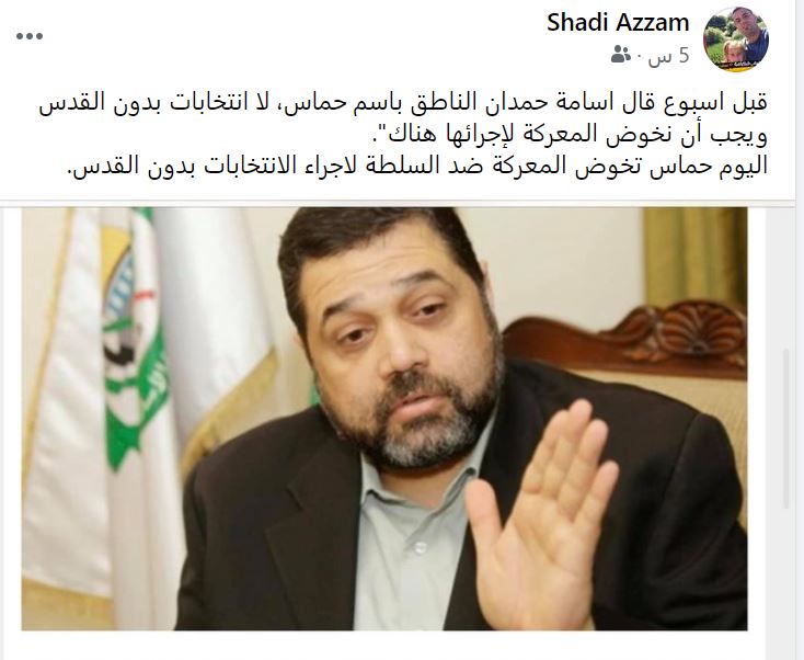 وأوضح “كنا نأمل بأن تمضي عملية الانتخابات حتى منتهاها، ولكن للأسف الشديد لم تكتمل لأسباب غير مقنعة إطلاقا”، مشددا على أن حماس كانت وما تزال “مع إجراء الانتخابات في مواعيدها المحددة، وتؤكد على وجوب إجراء الانتخابات في القدس”.