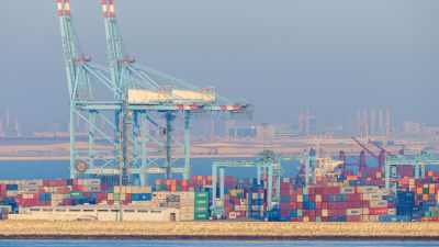 المنامة، البحرين - 8 يناير 2024: منظر بانورامي للميناء التجاري في البحرين