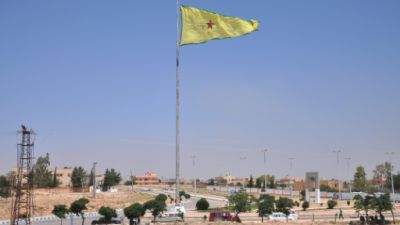 علم وحدات حماية الشعب الكردية مرفوعا في بلدة تل ابيض السورية
