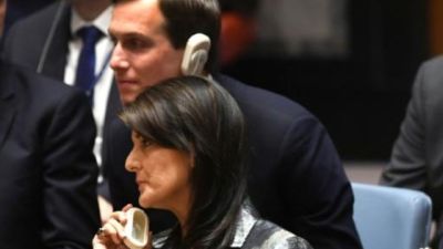 السفيرة الاميركية في الامم المتحدة نيكي هايلي والوسيط الاميركي للسلام في الشرق الاوسط جاريد كوشنر يستمعان الى كلمة الرئيس الفلسطيني محمود عباس امام مجلس الامن الدولي بنيويورك