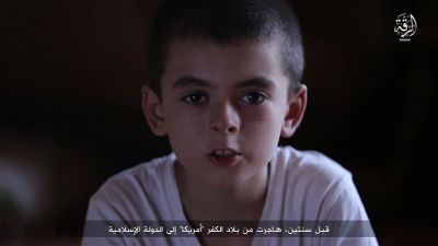 ويقول الطفل في فيديو دعائي جديد نشره التنظيم، إنه جاء إلى "دولة الخلافة" قبل سنتين مع والدته، وإنه ابن عسكري أمريكي سبق له أن خدم في العراق.