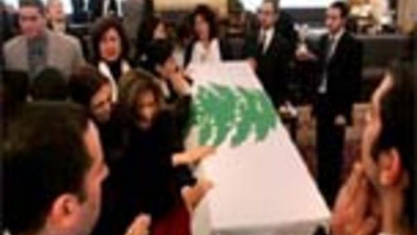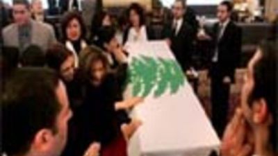 وكانت هناك لافتات تشيد بالحريري وتندد بقاتليه قرب منزله الذي نقل اليه الجثمان وقد لف بالعلم اللبناني استعدادا للجنازة. وبكت نساء من اسرة الحريري فوق النعش.