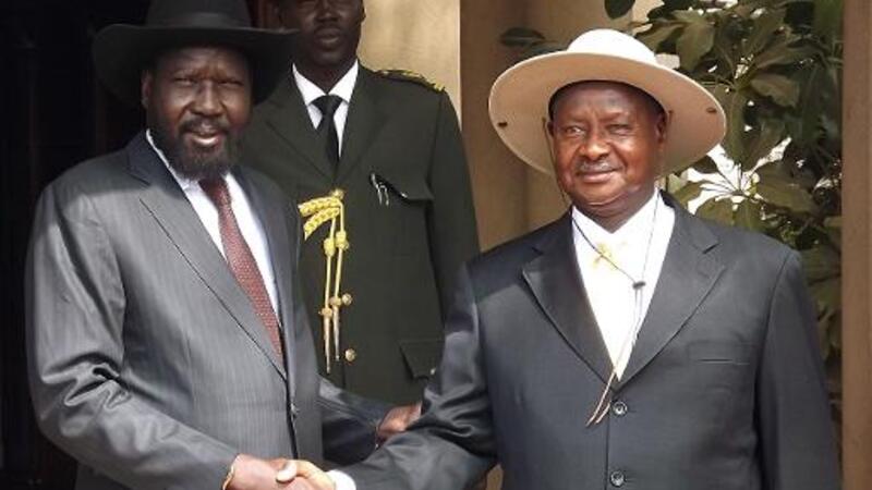 مصافحة بين الرئيس الاوغندي يوري موسيفيني (يمين) ورئيس جنوب السودان سلفا كير في جوبا في 30 كانون الاول/ديسمبر 2013