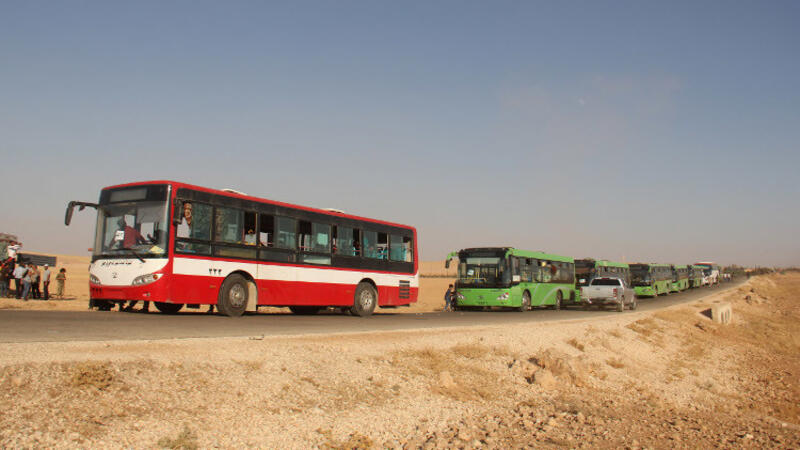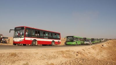 وصلت 40 حافلة إلى منطقة وادي حميد والملاهي في جرود عرسال بلبنان، لترحيل 395 مسلحا و1600 مدني من عائلاتهم، إلى ريف دمشق، في إطار تنفيذ اتفاق بين "جبهة النصرة" و"حزب الله" اللبناني.