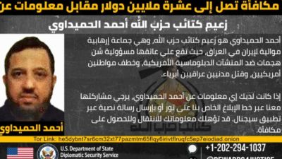 أعلنت وزارة الخارجية الأميركية رصد مكافأة تصل إلى 10 ملايين دولار مقابل معلومات تؤدي إلى تحديد مكان أحمد الحميداوي، زعيم “كتائب حزب الله” في العراق، وذلك ضمن برنامج “مكافآت من أجل العدالة”، الذي كشف أيضًا عن نشر صورته للمرة الأولى.