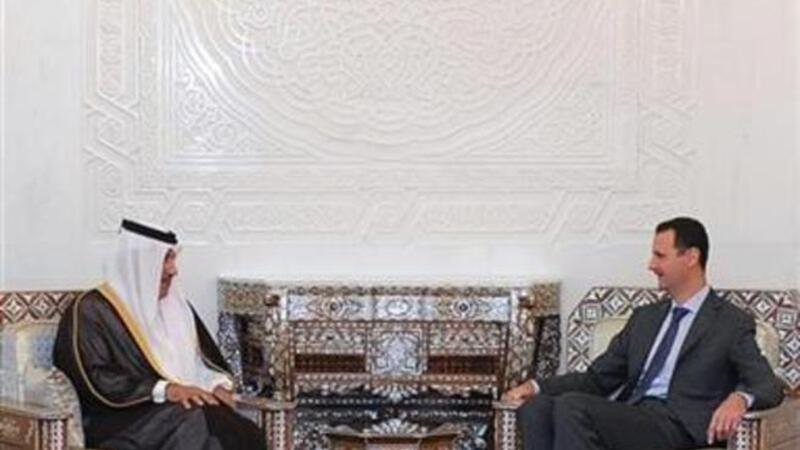 الرئيس السوري بشار الاسد (الى اليمين) اثناء اجتماعه مع رئيس وفد الجامعة العربية رئيس الوزراء القطري الشيخ حمد ال ثاني في دمشق يوم الاربعاء.