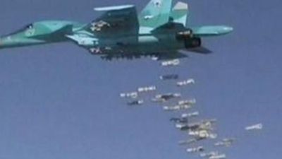 وقال المرصد إن مقاتلتين يعتقد أنهما روسيتان أسقطتا عشرات القنابل على بلدة الميادين في محافظة دير الزور التي تعد معقلا لتنظيم الدولة الإسلامية.