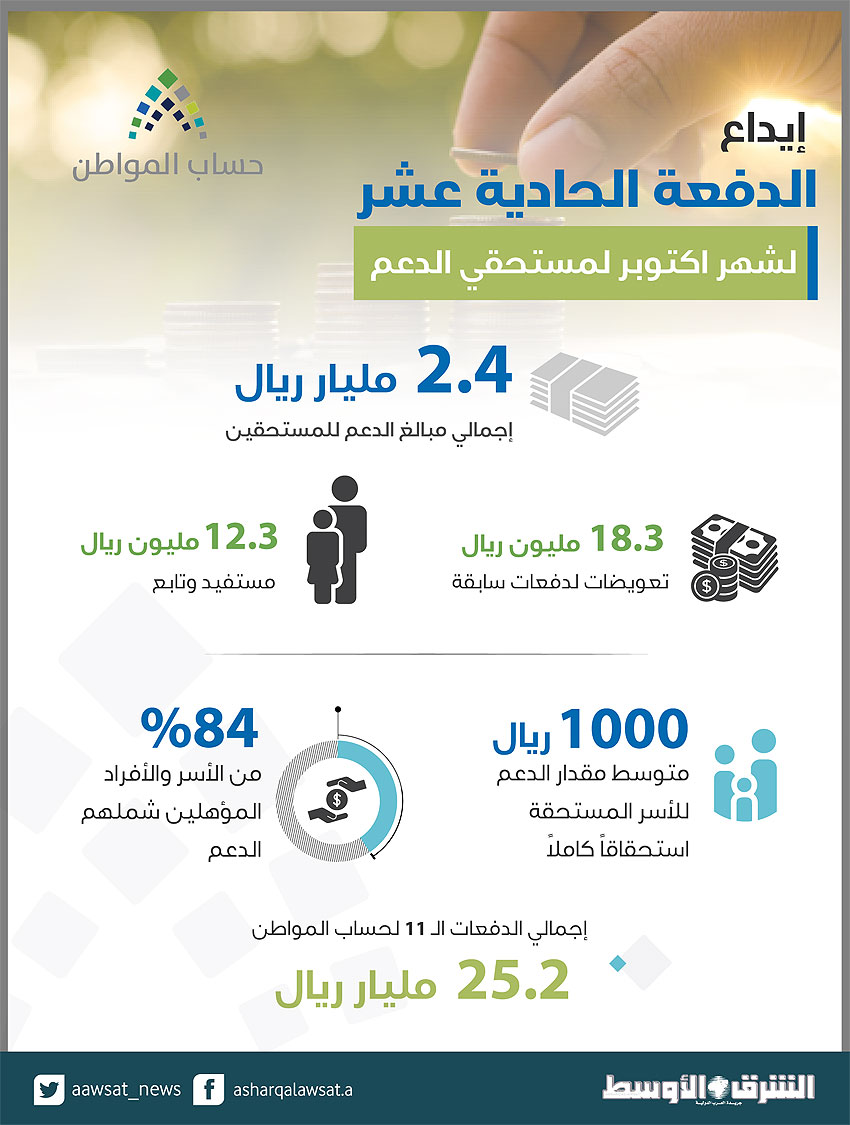 أودع برنامج «حساب المواطن» أكثر من 2.4 مليار ريال (640 مليون دولار) في حسابات مستحقي الدعم، تمثل 2.4 مليار ريال منها الدفعة الحادية عشرة من قيمة الدعم لشهر أكتوبر (تشرين الأول) الجاري، و8.3 مليون ريال (4.8 مليون دولار) تعويضات عن دفعات سابقة لمستحقين.