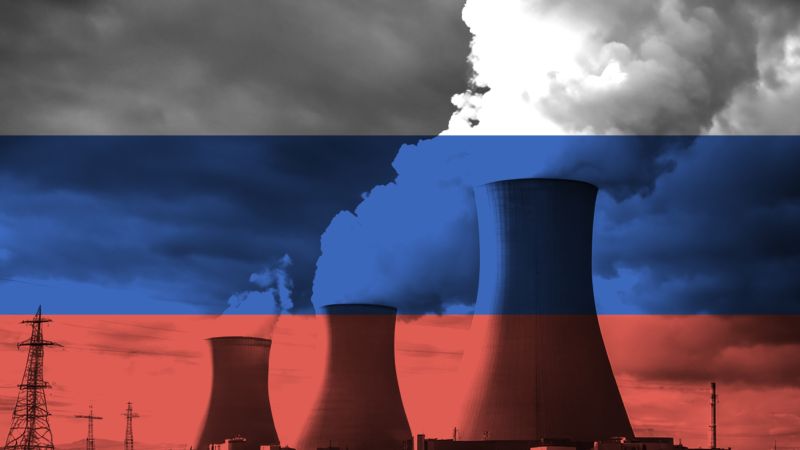 محطة طاقة نووية مع تراكب لعلم روسيا الوطني، ترمز إلى إنتاج الطاقة النظيفة.