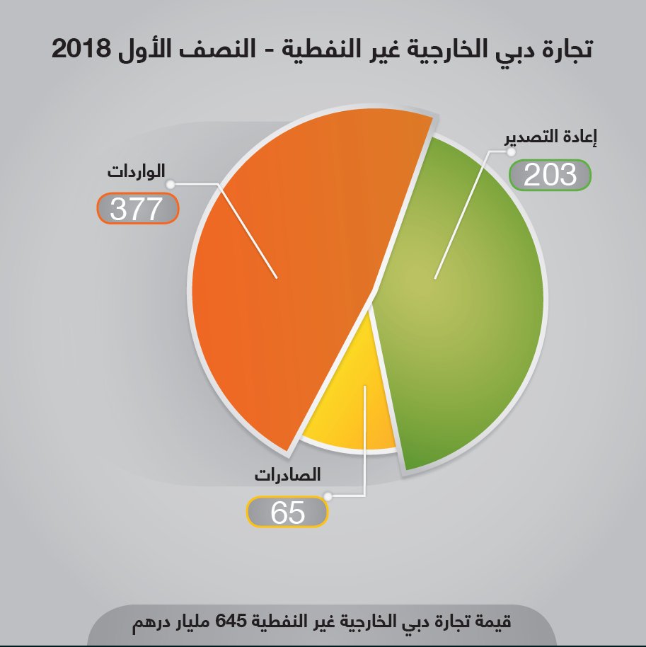 وسجلت تجارة إعادة التصدير نمواً قوياً مرتفعة بنسبة 14% تمثل زيادة بواقع 24 مليار درهم لتصل قيمتها إلى 203 مليارات درهم، ما يؤكد دور دبي كمركز إقليمي وعالمي لإعادة التصدير، فيما بلغت قيمة الواردات 377 مليار درهم والصادرات 65 مليار درهم.