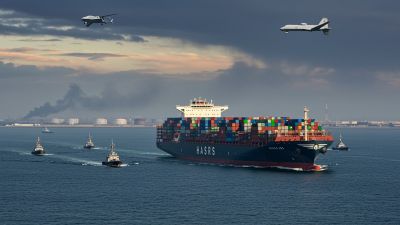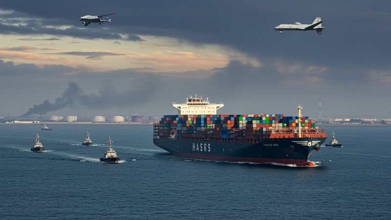 صورة خارجية لسفينة حاويات كبيرة تعبر مضيق هرمز، مع أجواء توحي بالتوتر في المشهد. السفينة محمّلة بالكامل وترفع علمًا محايدًا،