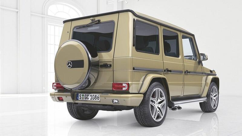 ولنبدأ من الخارج، حيث سيتم تقديم هذا الطراز بمجموعة من الألوان والتي تشمل مثلاً لون العقيق الناري، وأزرق موريشيوس المعدني، و رمادي Allanite Magno، وأصفر Magno الزيتوني. ويمكن للعملاء أيضا طلب لون السقف ليكون باللون الأسود البركاني، وتطعيمات أخرى، وحلقة من الستانلس ستيل لتثبيت غطاء الإطار الاحتياطي باللون الأسود أو من لون الهيكل. وتتابع مرسيدس أيضاً الموضة الحالية من خلال تقديم تشكيلة موسعة من الإطارات المعدنية باللون الأسود.