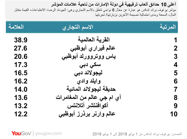 وبالنظر إلى انطباعات الأفراد خلال الـ 12 شهر الماضية عن حدائق الألعاب الترفيهية في دولة الإمارات، فقد كشف مؤشر يوغوف براند إندكس، مقياس التتبع اليومي من شركة يوغوف للعلامات التجارية، بأن القرية العالمية هي الوجهة المفضلة من ضمن حدائق الألعاب الترفيهية في الدولة حيث حصلت على علامة 38.9 على المؤشر، يليها عالم فيراري أبوظبي (27.6) و ياس ووتروورلد أبوظبي (20.6).
