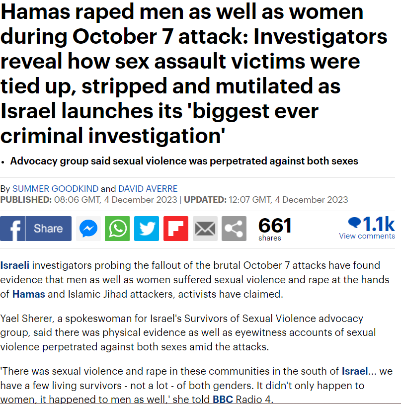 ونشرت صحيفة "ديلي ميل" البريطانية الاثنين، تقريرًا مطولًا مليئًا بالمزاعم والأكاذيب حول أحداث السابع من أكتوبر، وبعد تداول أكذوبة قطع رؤوس الأطفال واغتصاب النساء الإسرائيليين، تضمن التقرير ادعاءات حول اغتصاب رجال إسرائيليين من قبل مقاتلي حماس.