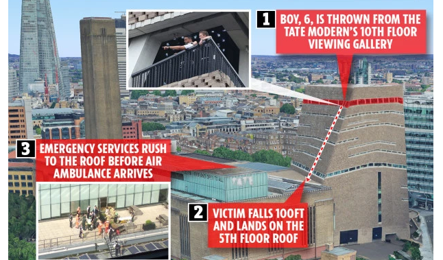 تعرض طفل فرنسي لإصابات خطيرة بعد أن ألقاه شخص من الطابق العاشر بمعرض "تيت مودرن" الفني بوسط العاصمة لندن يوم الأحد، وهو يرقد في مستشفى في حالة حرجة لكن مستقرة.