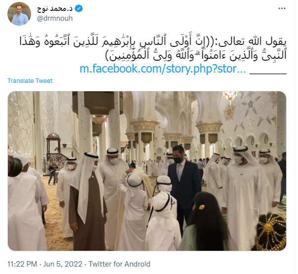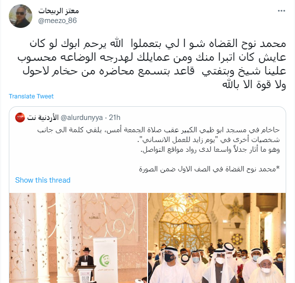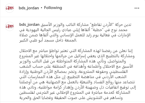 أصدرت حركة "الأردن تقاطع" بيانًا أدانت فيه مشاركة النائب والوزير الأسبق محمد نوح القضاة في "خطبة" ألقاها إيلي عبادي رئيس الجالية اليهودية في الإمارات في فعالية يوم زايد للعمل الإنساني والتي ألقاها ضمن صلاة الجمعة داخل مسجد أبو ظبي الكبير.