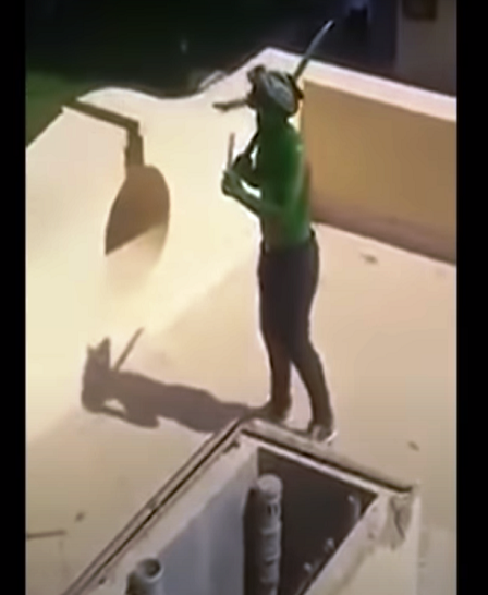 وبحسب مقطع الفيديو المتداول، اقترب أمين شرطة يرتدي سترة واقية من الرصاص "الرجل الأخضر"، حاول السيطرة عليه مستخدمًا عصا غليطًا إلا أن الرد جاء على غير المنشود، حاول الشاب سريع الحركة إصابته بتوجيه ضربات عشوائية بـ"سنجة" مرددًا عبارة "الله اكبر الله أكبر".