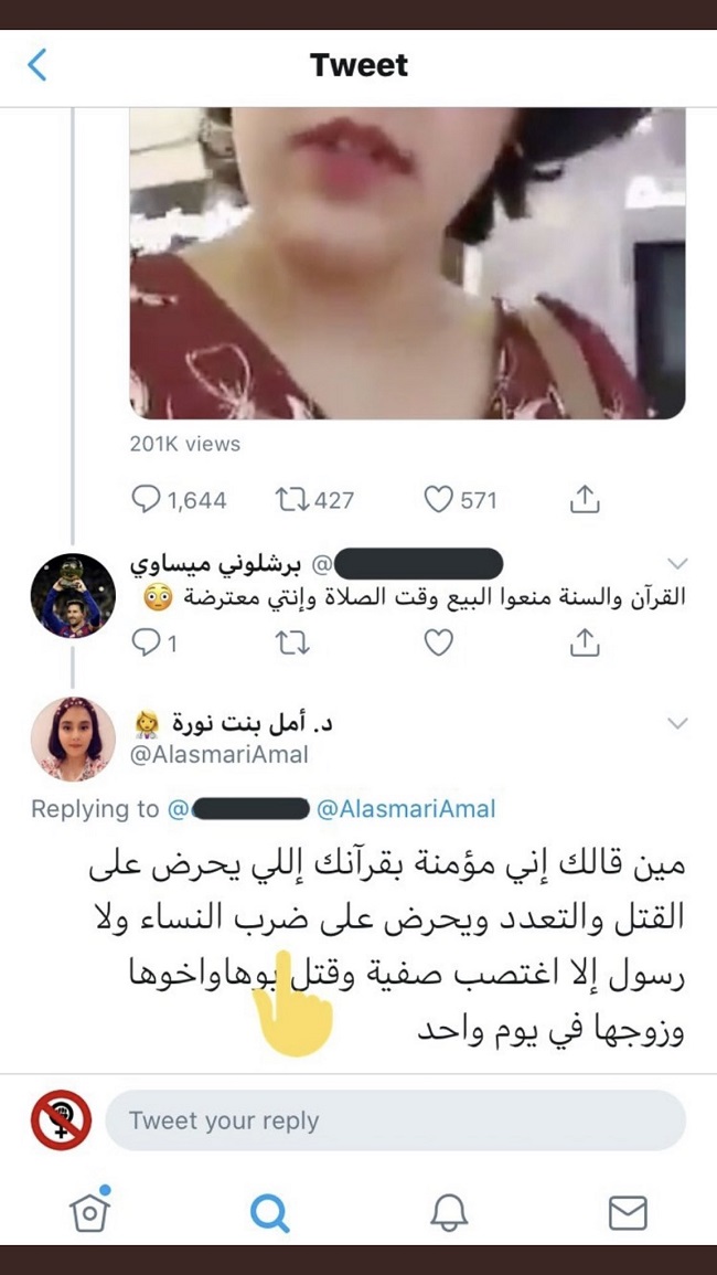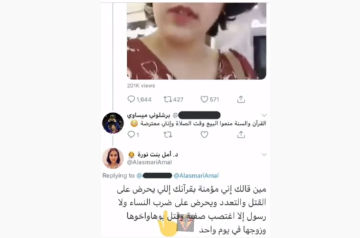 وتعلقيًا على التغريدة، كتب أحدهم للأسمري قائلًا: "القرآن والسنة منعوا البيع وقت الصلاة وانتي معترضة" وهو ما دفعها للتغريد بكلمات مسيئة لنبي محمد صلى الله عليه وسلم مثيرة غضب واستياء روّاد مواقع التواصل الاجتماعي.