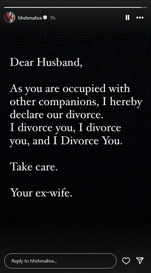 واختارت الشيخة مهرة بنت محمد بن راشد آل مكتوم طريقة غير تقليدية لإعلان طلاقها من زوجها، إذ نشرت الخبر عبر صفحتها الرسمية في تطبيق إنستغرام بعد عام وشهر على زواجهما.