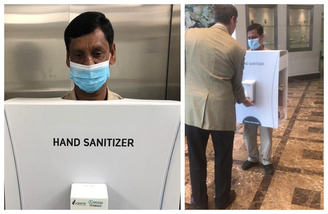 وبدا العامل في الصور حاملًا المُعقم الجداري لخدمة موظفي الشركة على مكاتبهم، مما أثار غضب واستياء متداوليها.