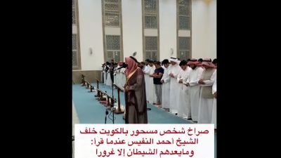 تداول رواد السوشال ميديا خلال الساعات الماضية فيديو من الكويت، لصراخ شخص في المسجد عند قراءة الإمام أحمد النفيسي الآية 64 من سورة الإسراء: "واستفزز من استطعت منهم بصوتك وأجلب عليهم بخيلك ورجلك وشاركهم في الأموال والأولاد وعدهم وما يعدهم الشيطان إلا غرورا".