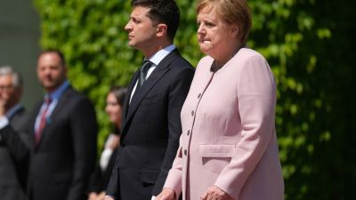 ورصدت عدسات الكاميرا "ميركل" وهي تقف الى جانب "زيلينسكي" على منصة، ريثما يؤدى النشيد الوطني للبلدين، لكن المستشارة الألمانية، شبكت يديها بشكل مفاجئ وظلت ترتعش لمدة تقارب خمسين ثانية.