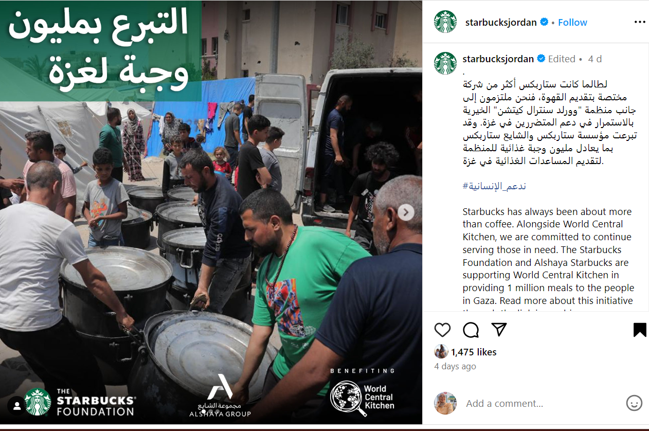 وأرفقت صورة الإعلان ببيان جاء فيه: "لطالما كانت ستاربكس أكثر من شركة مختصة بتقديم القهوة، فنحن ملتزمون إلى جانب منظمة "وورلد سنترال كيتشن" الخيرية بالاستمرار في دعم المتضررين في غزة. وقد تبرعت مؤسسة ستاربكس والشايع ستاربكس بما يعادل مليون وجبة غذائية للمنظمة لتقديم المساعدات الغذائية في غزة".