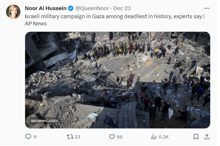 شاركت أرملة الملك الحسين، الملكة نور، مقالًا لوكالة أسوشيتد برس - Associated Press عبر حسابها الرسمي في منصة "إكس"، تويتر سابقًا، وصفت فيها الحملة العسكرية الإسرائيلية في قطاع غزة بأنها الأكثر دموية في التاريخ الحديث.