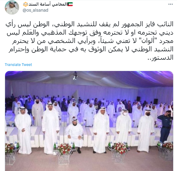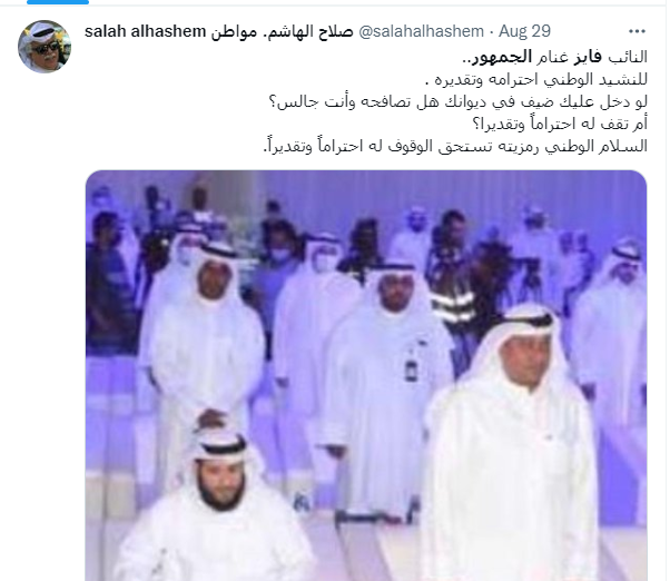 أثار عضو البرلمان فايز غنام الجمهور جدلًا في الشارع الكويتي بعد امتناعه عن الوقوف أثناء عزف النشيد الوطني خلال مناسبة رسمية.