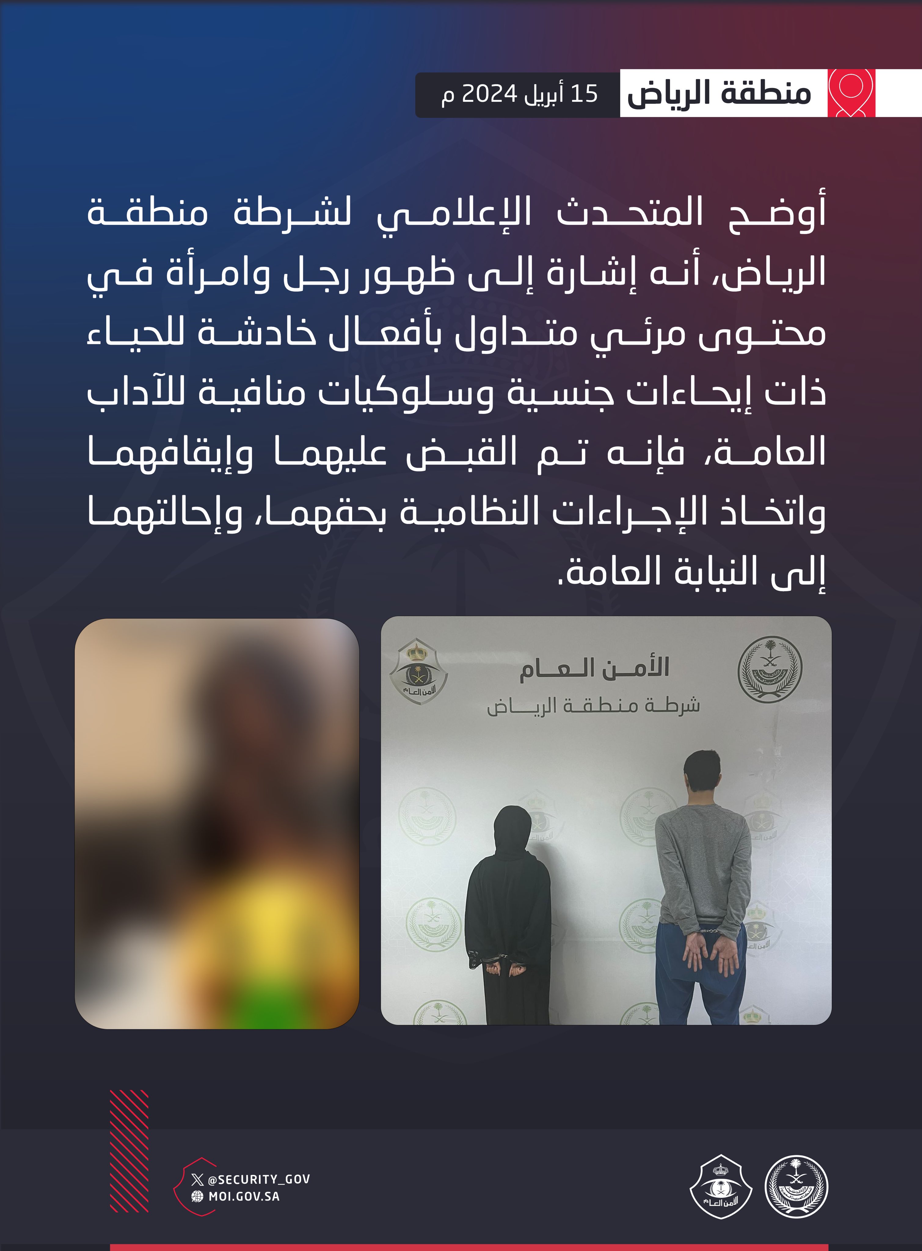 أعلنت شرطة الرياض عن القبض على رجل وامرأة ظهرا في محتوى مرئي بأفعال منافية للآداب العامة وسلوكيات خادشة للحياء.