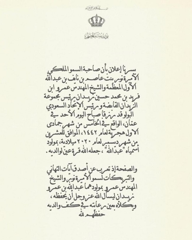 وجاء في بيان صادر عن المكتب الخاص بالأميرة نور ما يلي: "يسرنا إعلان بأن صاحبة السمو الملكي الأميرة نور بنت عاصم بن نايف بن عبدالله الأول المعظمة والشيخ المهندس عمرو بن فريد بن محمد حسين زيدان رئيس مجموعة الزيدان القابضة ورئيس الاتحاد السعودي البولو قد رزقا صباح الأحد في عمان الواقع في الخامس من شهر جمادى الأول هجرية لعام 1442 الموافق لعشرين من شهر ديسمبر لعام 2020 ميلادية بمولد أسمياه عبدالله جعله قرة عين لوالديه".