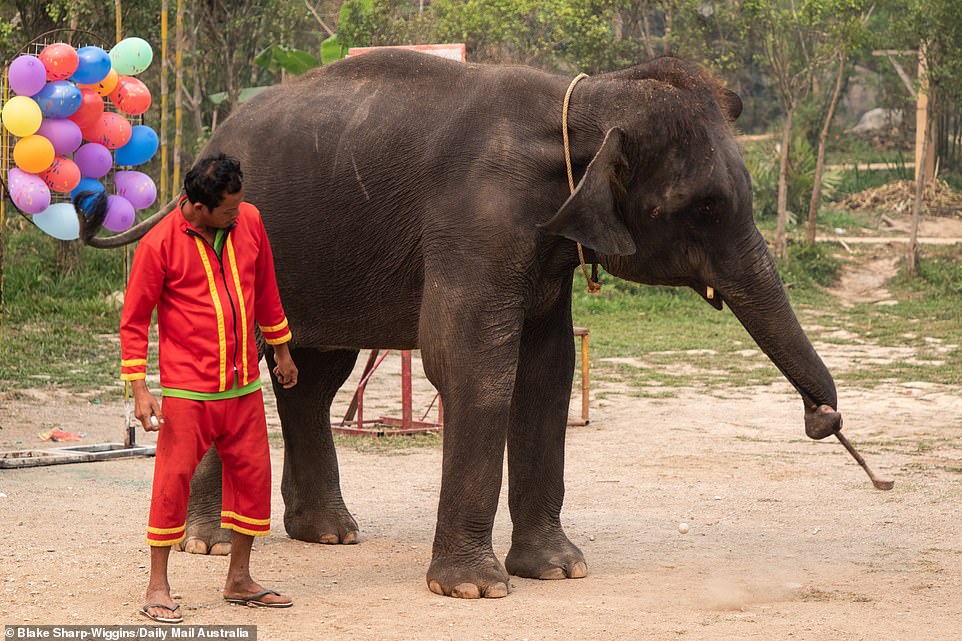 يجبر مدربو الأفيال في مدينة "تشيانغ ماي" في شمال تايلاند، أفيالهم على أداء الحركات البهلوانية والحيل تحت أشعة الشمس الحارقة، وهم مقيدون بالسلاسل الثقيلة، ويستخدمون خراطيمهم لرمي السهام على البالونات، لإمتاع السياح.