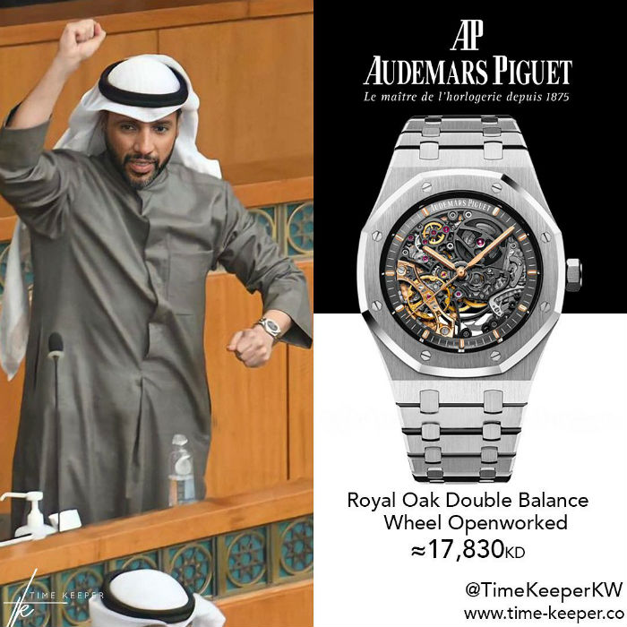 وشوهد الغانم أثناء احتفاله وهو يرتدي ساعة من علامة "اوديمار بيغيه" طراز "رويال اوك"- "اوبن ورك".