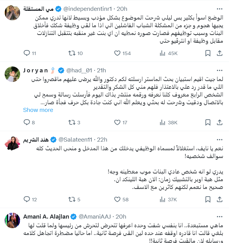 وسرعان ما وجدت العصيمي شكاوى مماثلة من مواطناتها، كشفن فيها عن تجارب شبيهة بما تواجهه من بعض مسؤولي التوظيف.