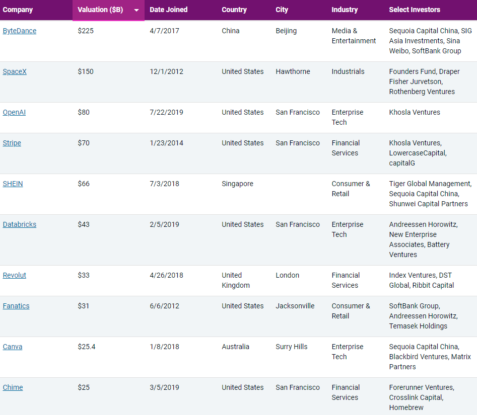 هناك عدد قليل فقط من شركات اليونيكورن في العالم، والتي حققت نمواً هائلاً في فترة زمنية قصيرة، ومعظمها يقع في وادي السيليكون ويعمل في صناعات متطورة مثل التكنولوجيا والرعاية الصحية والنقل.
