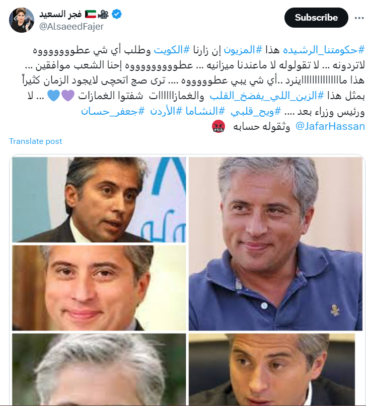 في تغريدة غير متوقعة ومثيرة للجدل، أشعلت الإعلامية الكويتية فجر السعيد منصات التواصل الاجتماعي بتغزلها الواضح والصريح في رئيس الوزراء الأردني الجديد، جعفر حسان.