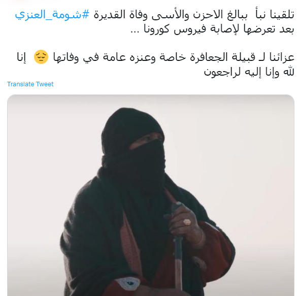 نعى الشعب السعودي ورواد مواقع التواصل الاجتماعي راعية الإبل السعودية الشهيرة شومة العنزي التي وافتها المنية يوم السبت، 19 فبراير 2022، بعد معاناتها مع المرض.