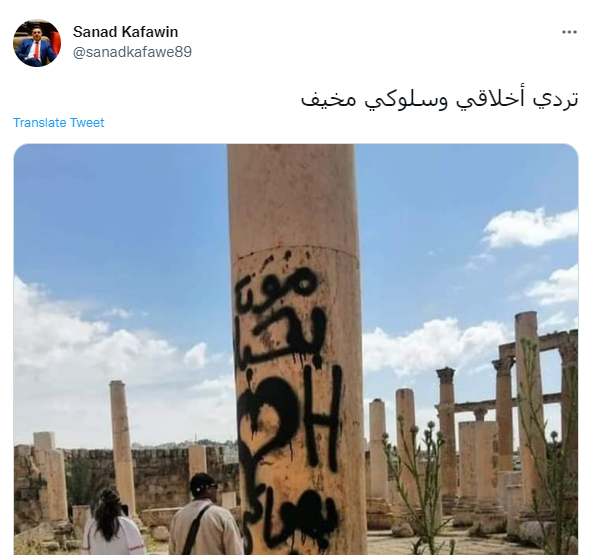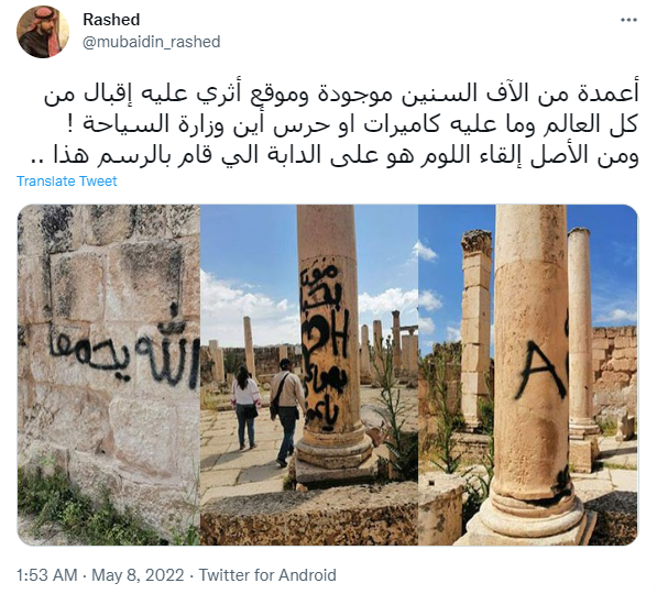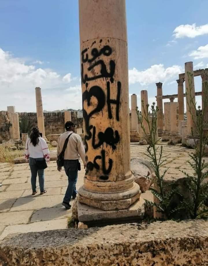 سادت حالة من الاستياء والغضب على الشارع الأردني بعد تداول صور لتشويه متعمد طال أحد أعمدة مدينة جرش الأثرية بطلاء رشاش أسود اللون.
