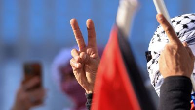 شاب فلسطيني يخرج من تحت الأنقاض رافعًا علامة النصر