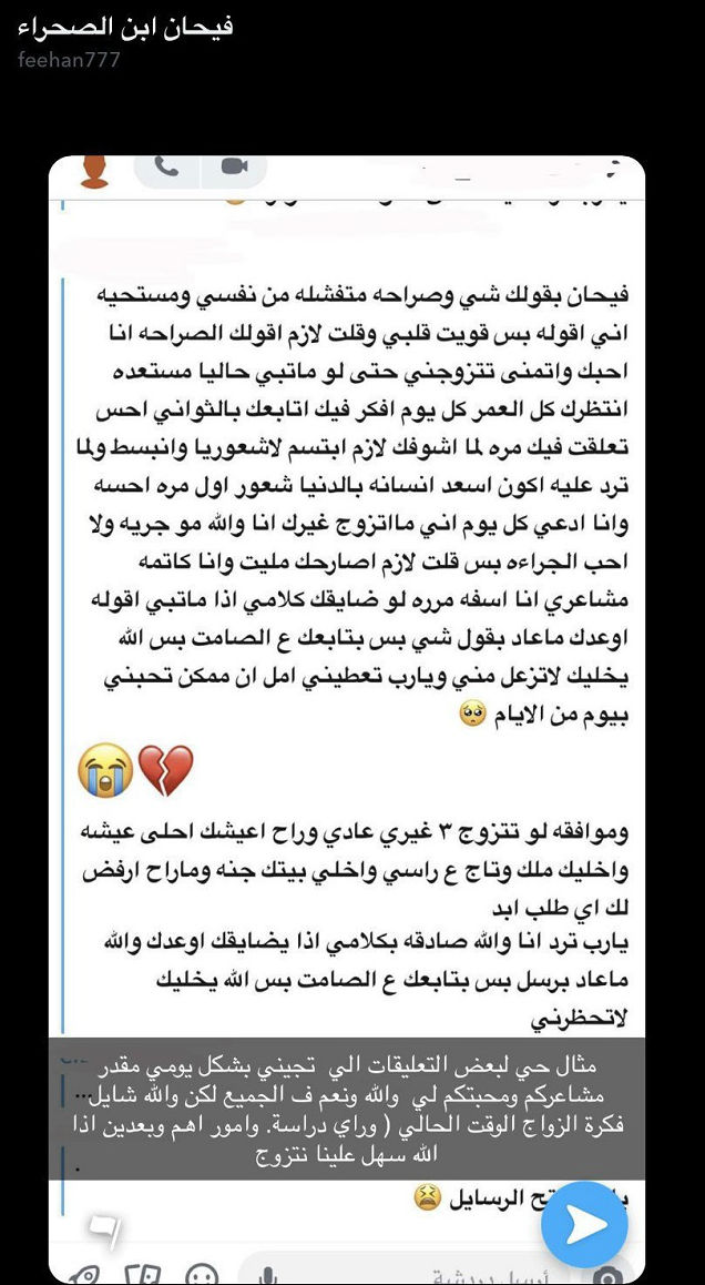وتابعت: "وموافقة لو تتزوج 3 غيري عادي وراح أعيشك أحلى عيشة وأخليك ملك وتاج على راسي وأخلي بيتك جنة وماراح أرفض لك أي طلب أبدًا.. يارب ترد أنا والله صادقة بكلامي إذا يضايقك أوعدك والله ما عاد برسل بس الله يخليك لا تحظرني".