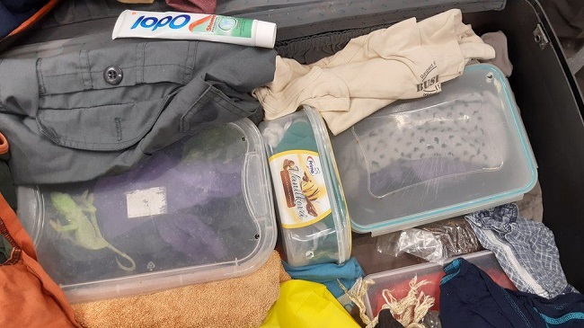 وبحسب شبكة "بي بي سي" البريطانية، فقد رُصدت الزواحف أثناء مرور الحقيبة المشبوهة داخل جهاز الأشعة السينية حث تم العثور على حوالي 74 حرباء مخبأة في جوارب وصناديق.