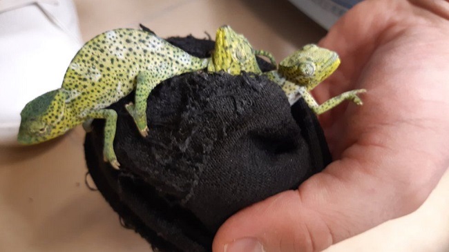 وتظهر الصورة ثلاث حرباء مخبأة في الجوارب، لكن ثلاثة منها لم تنجو خلال عملية التهريب فقد نفقت خلال الرحلة.