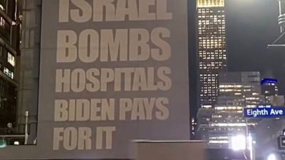 لافتة في شوارع نيويورك تندد بالعدوان الاسرائيلي على غزة.. "بايدن يدفع لهم"
