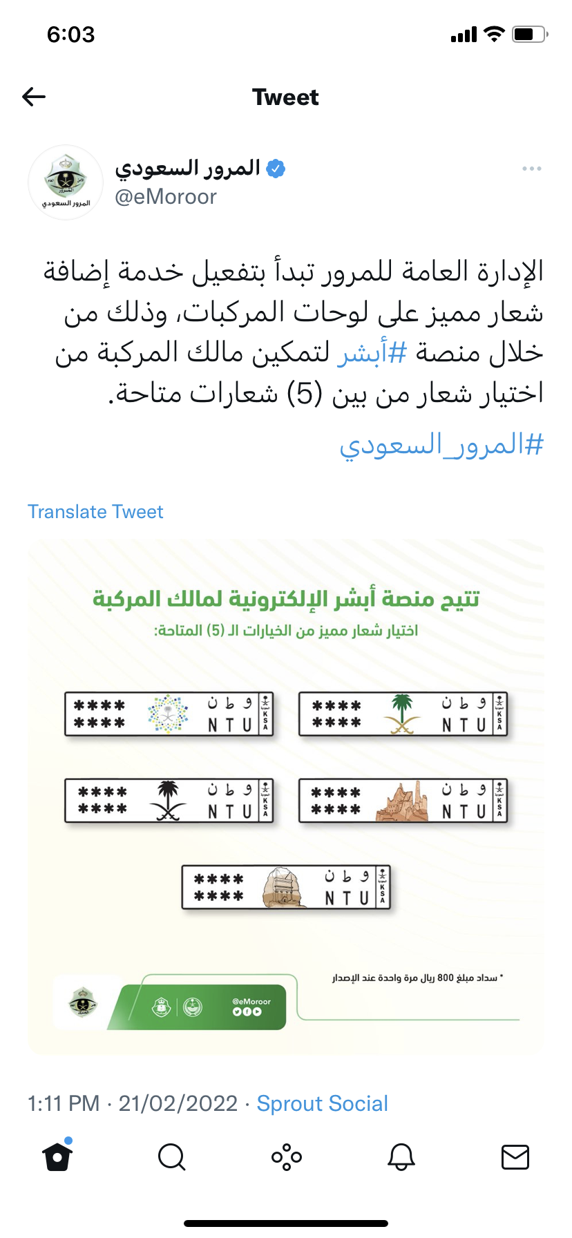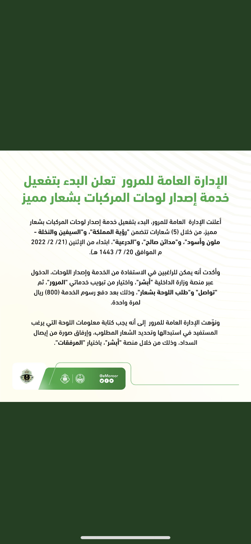 أعلنت الإدارة العامة المرور في المملكة العربية السعودية عن تفعيلها خدمة إصدار لوحات 'مميزة' بشعارٍ فريد يجري استصدارها ابتداء من اليوم الاثنين ٢١ فبراير ٢٠٢٢.