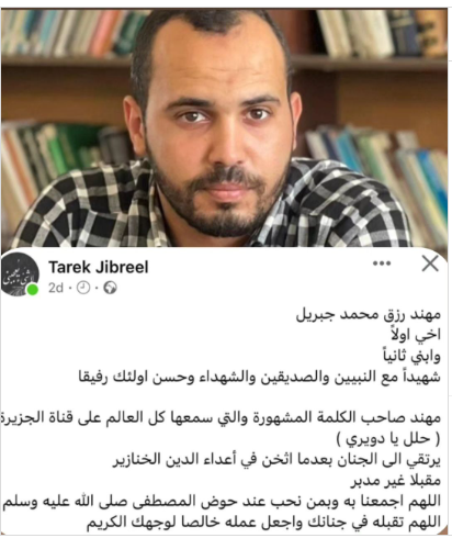 وقال طارق جبريل في بيانه على فيسبوك : "مهند رزق محمد جبريل، أخي أولاً، وابني ثانياً، شهيداً مع النبيين والصديقين والشهداء وحسن اولئك رفيقا، مهند صاحب الكلمة المشهورة والتي سمعها كل العالم على قناة الجزيرة ( حلل يا دويري)، يرتقي إلى الجنان بعدما أثخن في أعداء الدين، مقبلا غير مدبر، اللهم اجمعنا به وبمن نحب عند حوض المصطفى صلى الله عليه وسلم اللهم تقبله في جنانك واجعل عمله خالصا لوجهك الكريم".