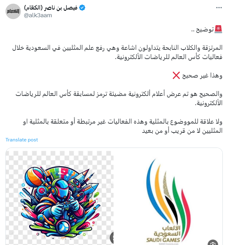 وأوضح فيصل بن ناصر، صاحب حساب الكعّام في منصة إكس، الحقيقة وراء الأعلام قائلاً إن تلك المعروضة في الحدث العالمي هي أعلام إلكترونية مضيئة وترمز إلى الألعاب عبر الإنترنت بالإضافة إلى مؤسسة كأس العالم للرياضات الإلكترونية (Esports World Cup Foundation - EWCF) ولا علاقة لها بـ LGBTQ أو علم الفخر.
