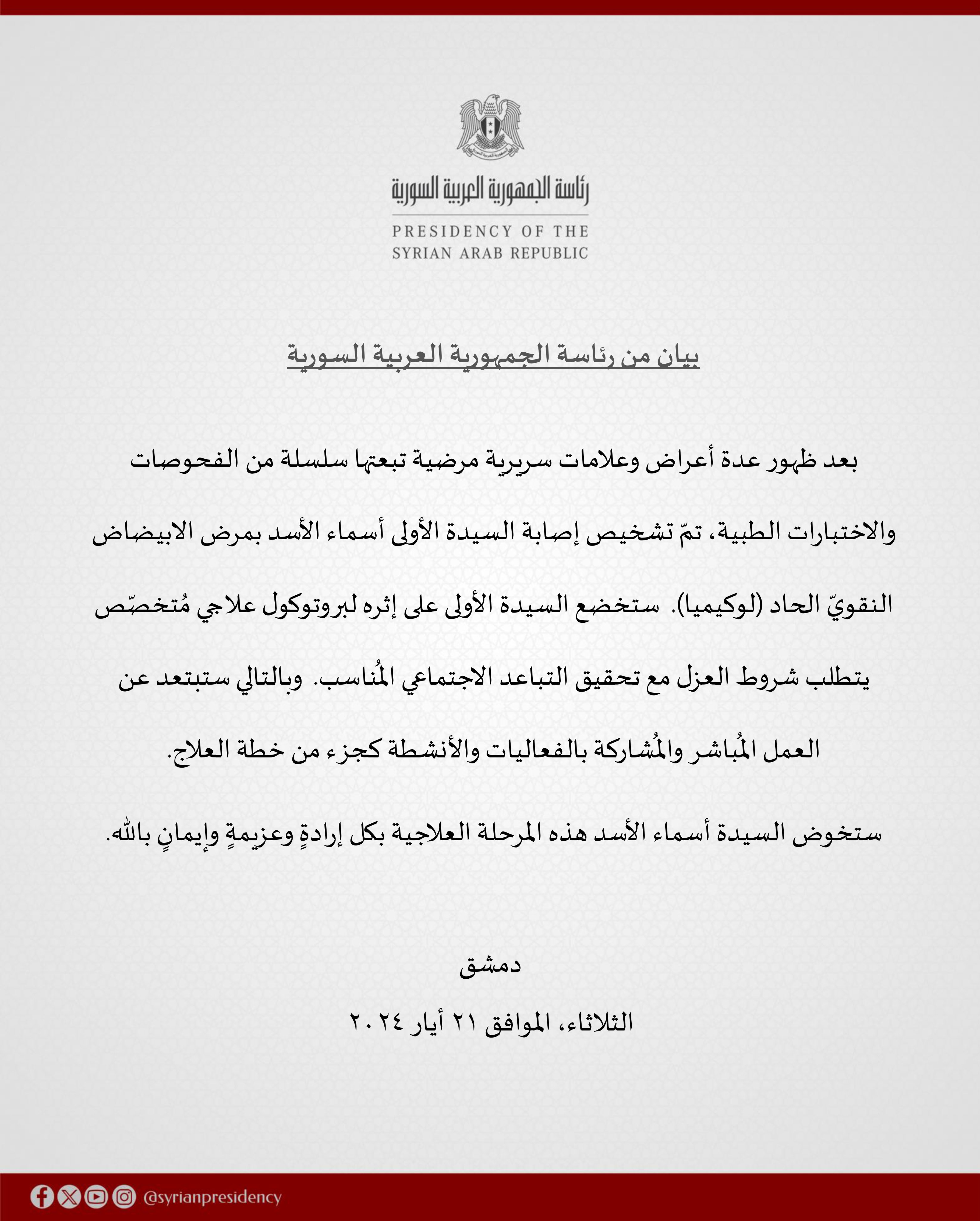 أعلنت الرئاسة السورية، الثلاثاء، إصابة أسماء الأسد، 48 عاماً، زوجة بشار الأسد، بسرطان الدم، وذلك بعد سنوات من إعلانها شفاءها “الكامل” من سرطان الثدي.