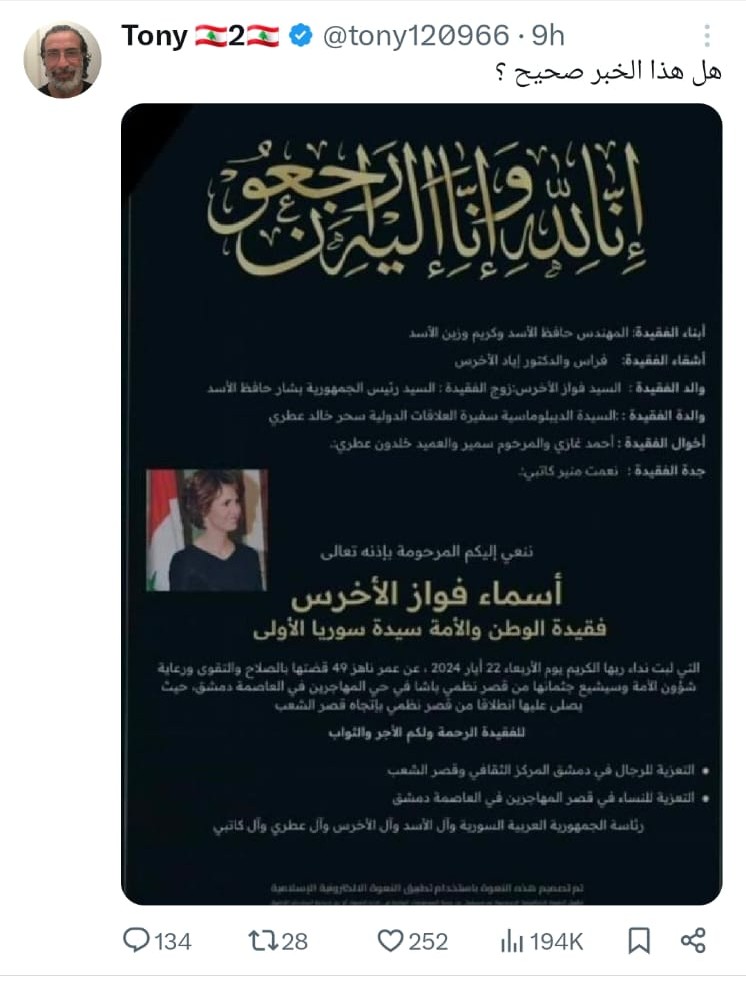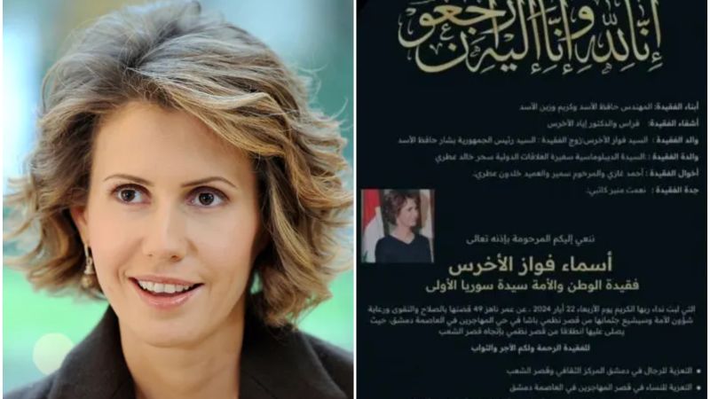 وبدأت الحكاية حين انتشرت في منصات التواصل الاجتماعي صورة لـ "ورقة نعي" مزعومة لزوجة الرئيس السوري بشار الأسد، دون الاستناد لتصريح رسمي أو مصدر مطلع.