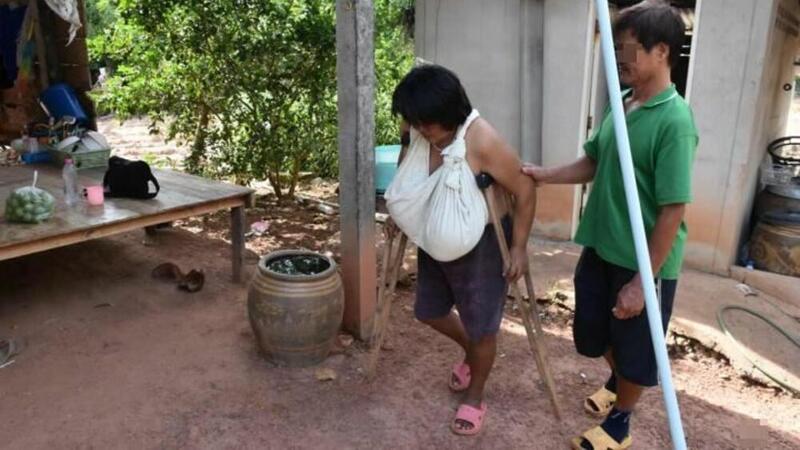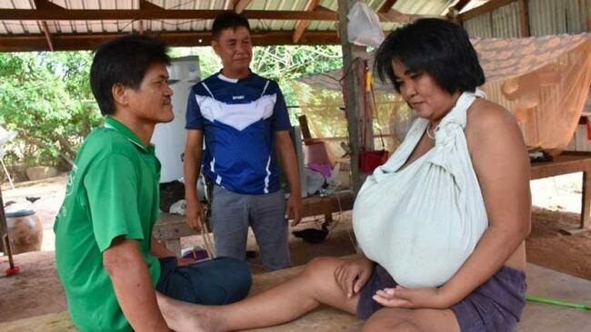 باتت امرأة تايلاندية غير قادرة على المشي دون عكازيها بعد أن نما ثدييها بشكل لا يمكن السيطرة عليه.
