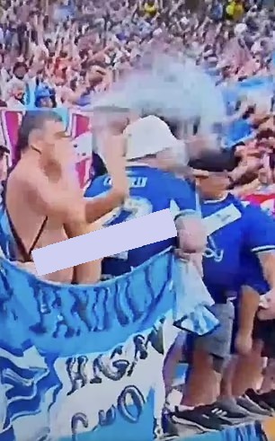 وعلى الرغم من أن المشجعة حاولت الاستتار خلف علم بلادها الكبير، إلا أن عدسات الكاميرات تمكنت من التقاط اللقطة "الصادمة" التي يعتذر موقع البوابة نشرها.